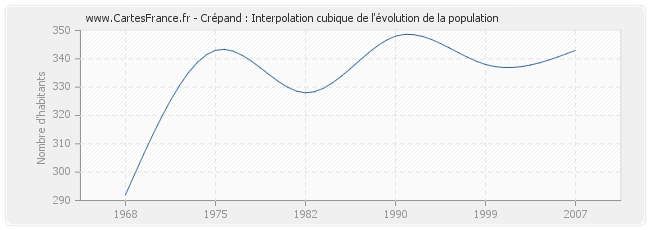Cette courbe reprend l'historique de la population de Crépand de 1968 à 2007 en interpolation cubique. Ceci permet d'obtenir plus précisément la population de la commune de Crépand les années ou aucun recensement n'a été effectué.