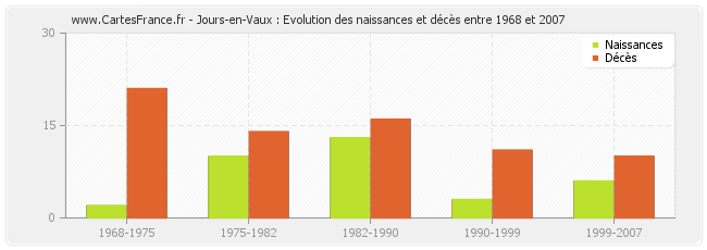 Jours-en-Vaux : évolution des naissances et décès de 1968 à 2007