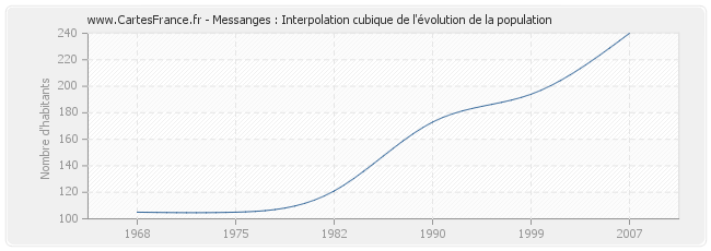 Cette courbe reprend l'historique de la population de Messanges de 1968 à 2007 en interpolation cubique. Ceci permet d'obtenir plus précisément la population de la commune de Messanges les années ou aucun recensement n'a été effectué.