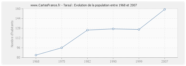 Cette courbe reprend l'historique de la population de Tarsul de 1968 à 2007 en interpolation cubique. Ceci permet d'obtenir plus précisément la population de la commune de Tarsul les années ou aucun recensement n'a été effectué.
