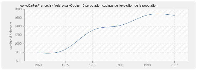 Cette courbe reprend l'historique de la population de Velars-sur-Ouche de 1968 à 2007 en interpolation cubique. Ceci permet d'obtenir plus précisément la population de la commune de Velars-sur-Ouche les années ou aucun recensement n'a été effectué.