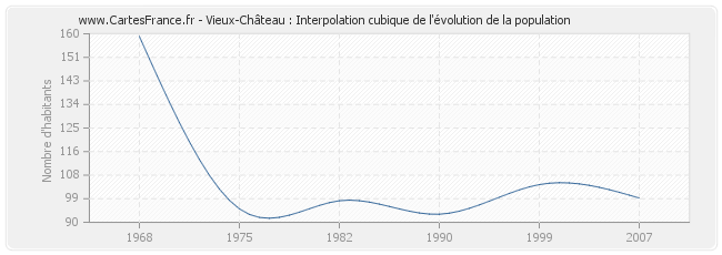 Cette courbe reprend l'historique de la population de Vieux-Château de 1968 à 2007 en interpolation cubique. Ceci permet d'obtenir plus précisément la population de la commune de Vieux-Château les années ou aucun recensement n'a été effectué.