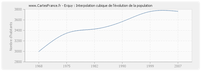 Cette courbe reprend l'historique de la population d'Erquy de 1968 à 2007 en interpolation cubique. Ceci permet d'obtenir plus précisément la population de la commune d'Erquy les années ou aucun recensement n'a été effectué.