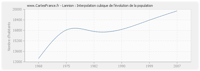 Cette courbe reprend l'historique de la population de Lannion de 1968 à 2007 en interpolation cubique. Ceci permet d'obtenir plus précisément la population de la commune de Lannion les années ou aucun recensement n'a été effectué.