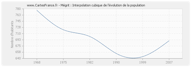 Cette courbe reprend l'historique de la population de Mégrit de 1968 à 2007 en interpolation cubique. Ceci permet d'obtenir plus précisément la population de la commune de Mégrit les années ou aucun recensement n'a été effectué.