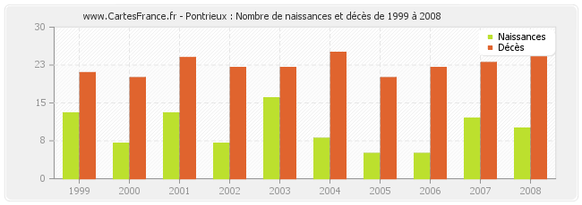 - Pontrieux en 2008 : 10 naissances et 25 décès