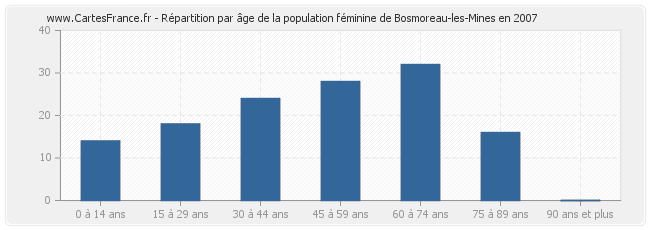 - Femmes de 60 à 74 ans habitant Bosmoreau-les-Mines : 32