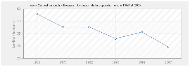 La population de Brousse était de 27 habitants en 2007, 36 habitants en 1999, 32 habitants en 1990, 39 habitants en 1982, 39 habitants en 1975 et 47 habitants en 1968.