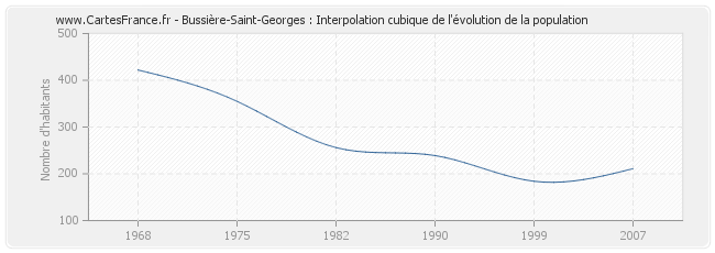 Cette courbe reprend l'historique de la population de Bussière-Saint-Georges de 1968 à 2007 en interpolation cubique. Ceci permet d'obtenir plus précisément la population de la commune de Bussière-Saint-Georges les années ou aucun recensement n'a été effectué.