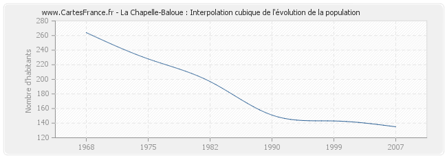Cette courbe reprend l'historique de la population de La Chapelle-Baloue de 1968 à 2007 en interpolation cubique. Ceci permet d'obtenir plus précisément la population de la commune de La Chapelle-Baloue les années ou aucun recensement n'a été effectué.