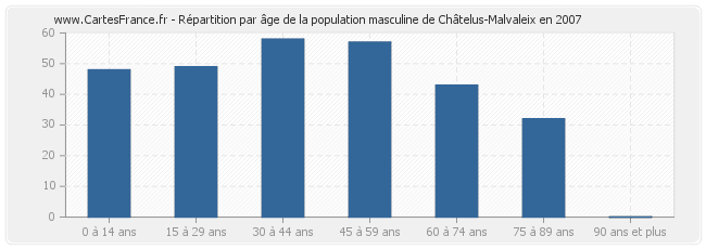 Répartition de la population masculine de Châtelus-Malvaleix par âge en 2007 :