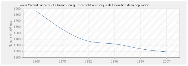 Cette courbe reprend l'historique de la population de Le Grand-Bourg de 1968 à 2007 en interpolation cubique. Ceci permet d'obtenir plus précisément la population de la commune de Le Grand-Bourg les années ou aucun recensement n'a été effectué.