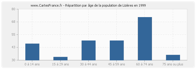 - Population de Lizières de 60 à 74 ans : 62 habitants