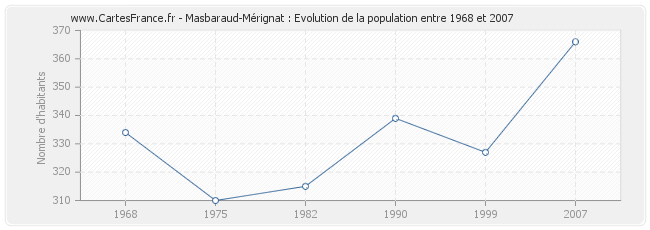 La population de Masbaraud-Mérignat était de 366 habitants en 2007, 327 habitants en 1999, 339 habitants en 1990, 315 habitants en 1982, 310 habitants en 1975 et 334 habitants en 1968.