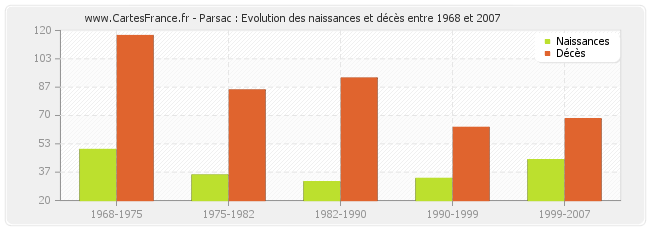 Parsac : évolution des naissances et décès de 1968 à 2007
