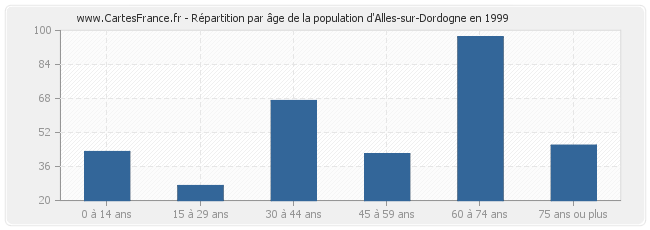 Répartition de la population d'Alles-sur-Dordogne par âge en 1999 :