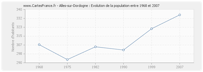 La population d'Alles-sur-Dordogne était de 335 habitants en 2007, 322 habitants en 1999, 302 habitants en 1990, 305 habitants en 1982, 293 habitants en 1975 et 307 habitants en 1968.