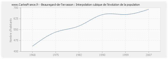 Cette courbe reprend l'historique de la population de Beauregard-de-Terrasson de 1968 à 2007 en interpolation cubique. Ceci permet d'obtenir plus précisément la population de la commune de Beauregard-de-Terrasson les années ou aucun recensement n'a été effectué.