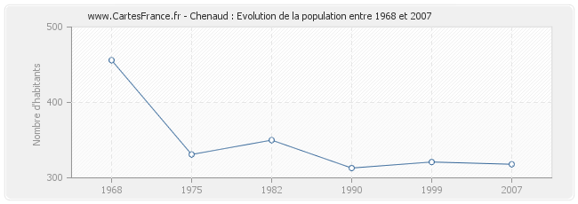 Cette courbe reprend l'historique de la population de Chenaud de 1968 à 2007 en interpolation cubique. Ceci permet d'obtenir plus précisément la population de la commune de Chenaud les années ou aucun recensement n'a été effectué.
