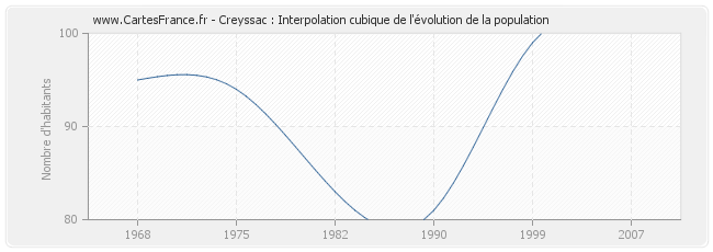 Cette courbe reprend l'historique de la population de Creyssac de 1968 à 2007 en interpolation cubique. Ceci permet d'obtenir plus précisément la population de la commune de Creyssac les années ou aucun recensement n'a été effectué.