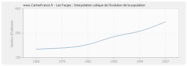 Cette courbe reprend l'historique de la population de Les Farges de 1968 à 2007 en interpolation cubique. Ceci permet d'obtenir plus précisément la population de la commune de Les Farges les années ou aucun recensement n'a été effectué.