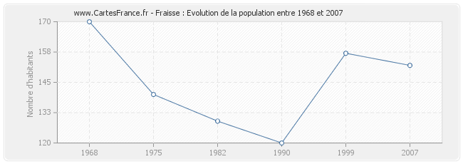 La population de Fraisse était de 152 habitants en 2007, 157 habitants en 1999, 120 habitants en 1990, 129 habitants en 1982, 140 habitants en 1975 et 170 habitants en 1968.