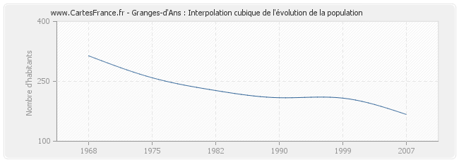 Cette courbe reprend l'historique de la population de Granges-d'Ans de 1968 à 2007 en interpolation cubique. Ceci permet d'obtenir plus précisément la population de la commune de Granges-d'Ans les années ou aucun recensement n'a été effectué.