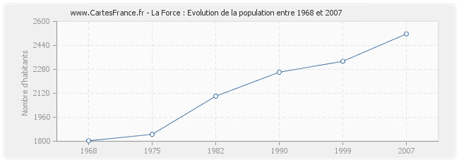La population de La Force était de 2 517 habitants en 2007, 2 334 habitants en 1999, 2 261 habitants en 1990, 2 101 habitants en 1982, 1 846 habitants en 1975 et 1 803 habitants en 1968.