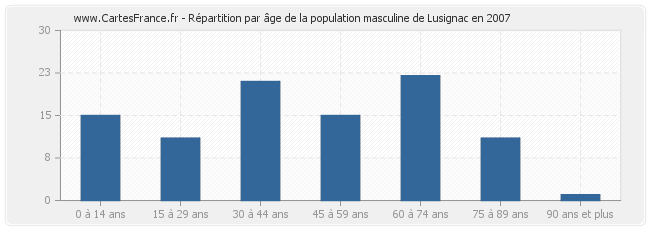 Répartition de la population masculine de Lusignac par âge en 2007 :