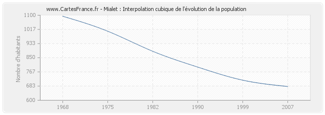 Cette courbe reprend l'historique de la population de Mialet de 1968 à 2007 en interpolation cubique. Ceci permet d'obtenir plus précisément la population de la commune de Mialet les années ou aucun recensement n'a été effectué.