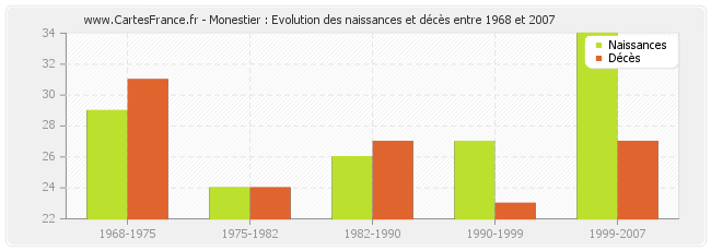 Monestier : évolution des naissances et décès de 1968 à 2007