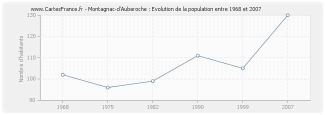 La population de Montagnac-d'Auberoche était de 130 habitants en 2007, 105 habitants en 1999, 111 habitants en 1990, 99 habitants en 1982, 96 habitants en 1975 et 102 habitants en 1968.