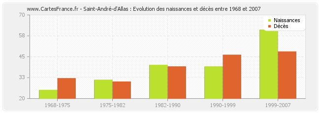 Saint-André-d'Allas : évolution des naissances et décès de 1968 à 2007
