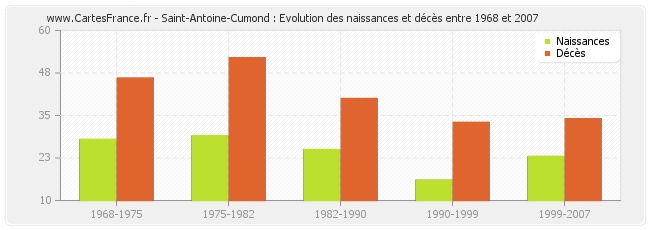 Saint-Antoine-Cumond : évolution des naissances et décès de 1968 à 2007