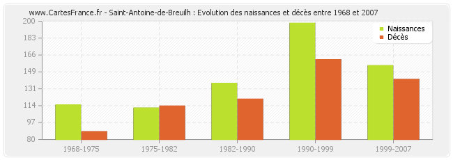 Saint-Antoine-de-Breuilh : évolution des naissances et décès de 1968 à 2007