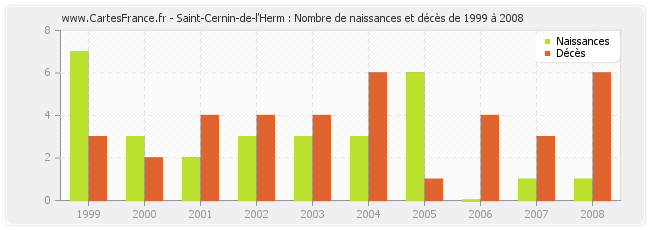 - Saint-Cernin-de-l'Herm en 2008 : 1 naissances et 6 décès
