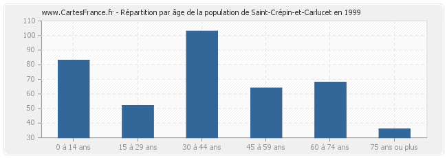 - Population de Saint-Crépin-et-Carlucet de 30 à 44 ans : 103 habitants