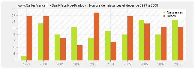 - Saint-Front-de-Pradoux en 2008 : 13 naissances et 11 décès