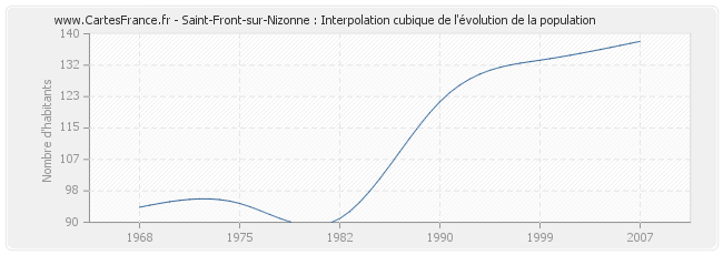 Cette courbe reprend l'historique de la population de Saint-Front-sur-Nizonne de 1968 à 2007 en interpolation cubique. Ceci permet d'obtenir plus précisément la population de la commune de Saint-Front-sur-Nizonne les années ou aucun recensement n'a été effectué.