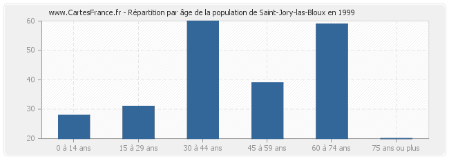 Répartition de la population de Saint-Jory-las-Bloux par âge en 1999 :