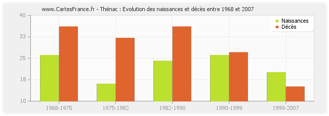Thénac : évolution des naissances et décès de 1968 à 2007