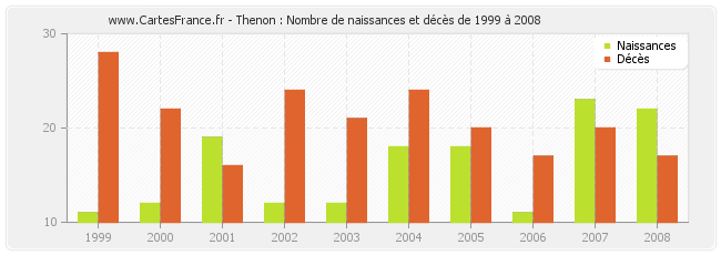 Thenon : évolution des naissances et décès de 1968 à 2007