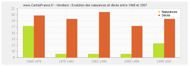 Vendoire : évolution des naissances et décès de 1968 à 2007