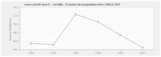 Cette courbe reprend l'historique de la population de Verteillac de 1968 à 2007 en interpolation cubique. Ceci permet d'obtenir plus précisément la population de la commune de Verteillac les années ou aucun recensement n'a été effectué.
