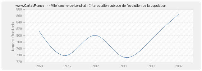 Cette courbe reprend l'historique de la population de Villefranche-de-Lonchat de 1968 à 2007 en interpolation cubique. Ceci permet d'obtenir plus précisément la population de la commune de Villefranche-de-Lonchat les années ou aucun recensement n'a été effectué.