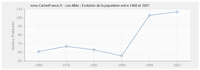 La population de Les Alliés était de 107 habitants en 2007, 103 habitants en 1999, 56 habitants en 1990, 63 habitants en 1982, 67 habitants en 1975 et 61 habitants en 1968.