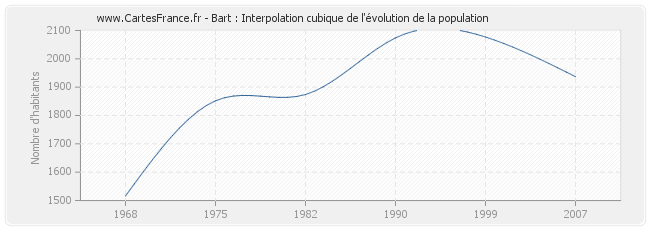 Cette courbe reprend l'historique de la population de Bart de 1968 à 2007 en interpolation cubique. Ceci permet d'obtenir plus précisément la population de la commune de Bart les années ou aucun recensement n'a été effectué.
