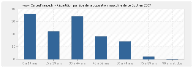 - Hommes de 0 à 14 ans habitant Le Bizot : 36