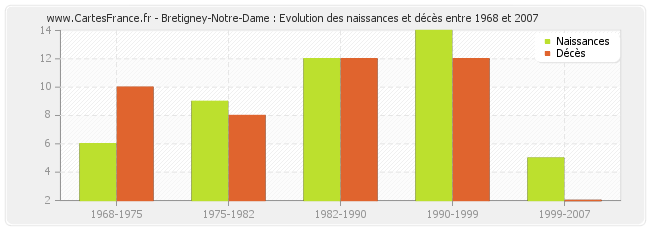 Bretigney-Notre-Dame : évolution des naissances et décès de 1968 à 2007