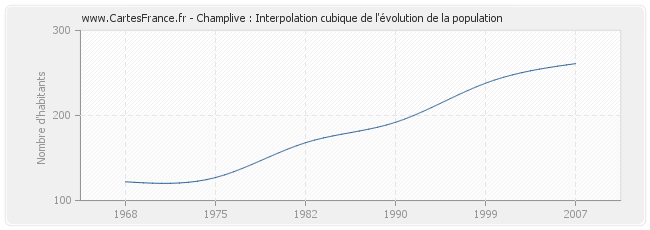 Cette courbe reprend l'historique de la population de Champlive de 1968 à 2007 en interpolation cubique. Ceci permet d'obtenir plus précisément la population de la commune de Champlive les années ou aucun recensement n'a été effectué.
